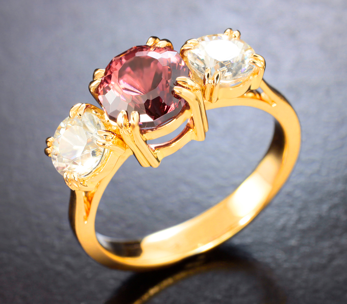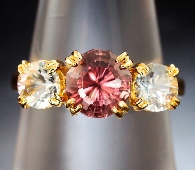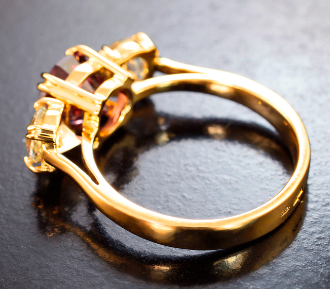 Кольцо с цирконом падпараджа авторской огранки 2,4 карата и бесцветными цирконами