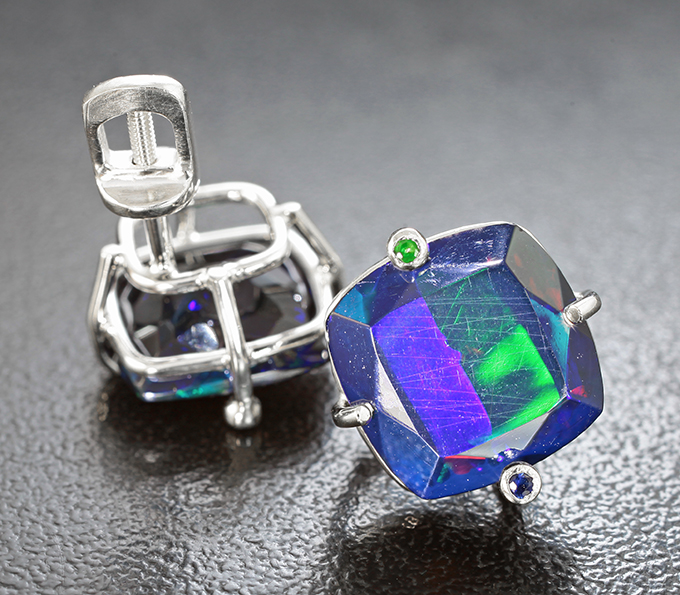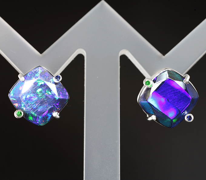 Пусеты с ограненными черными опалами 6,5 карата, синими сапфирами и цаворитами