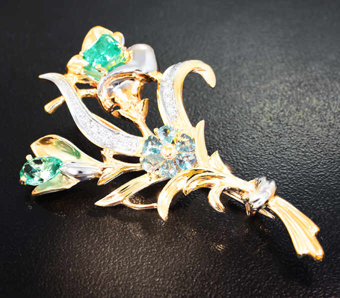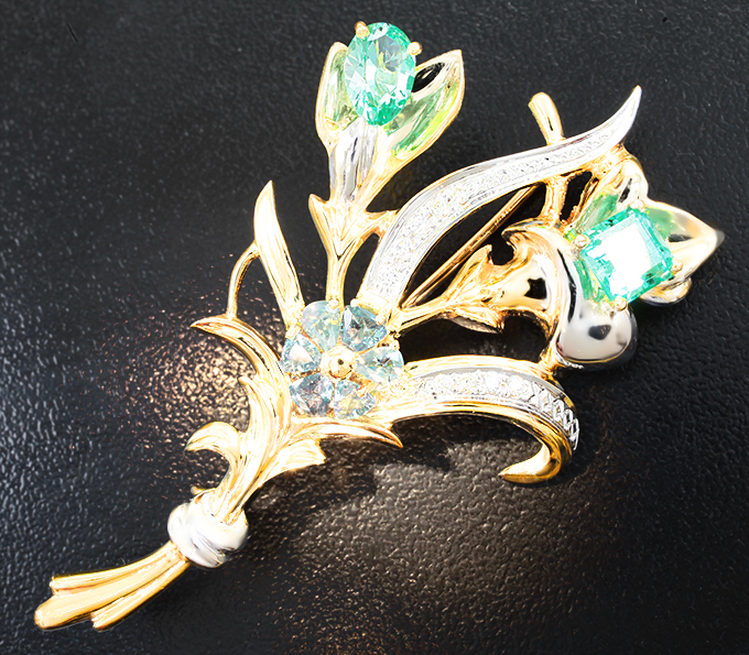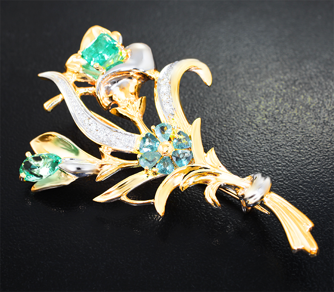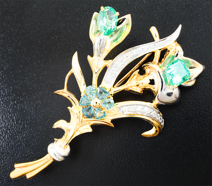 Брошь с уральскими изумрудами 1,89 карата, александритами и бриллиантами