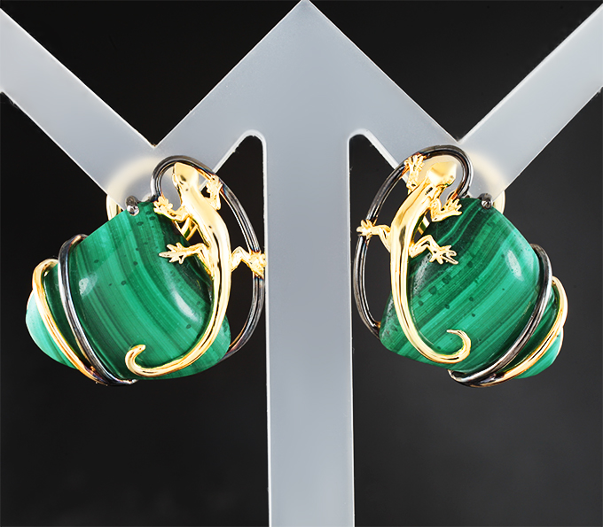 Вашему вниманию предлагаются серьги из желтого золота 585 пробы с уральским малахитом! Изделие с чернением. Площадка серег 22 х 19 мм. Вес пары 10,12 г. Ниже приводятся ювелирные характеристики вставок.
