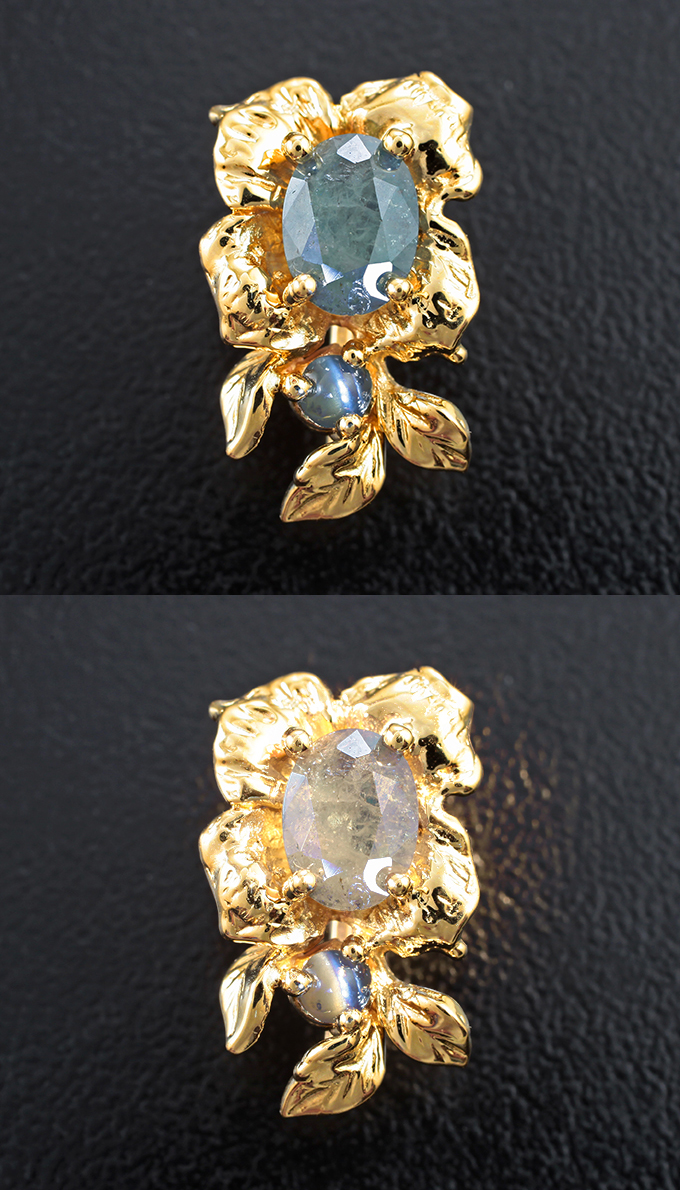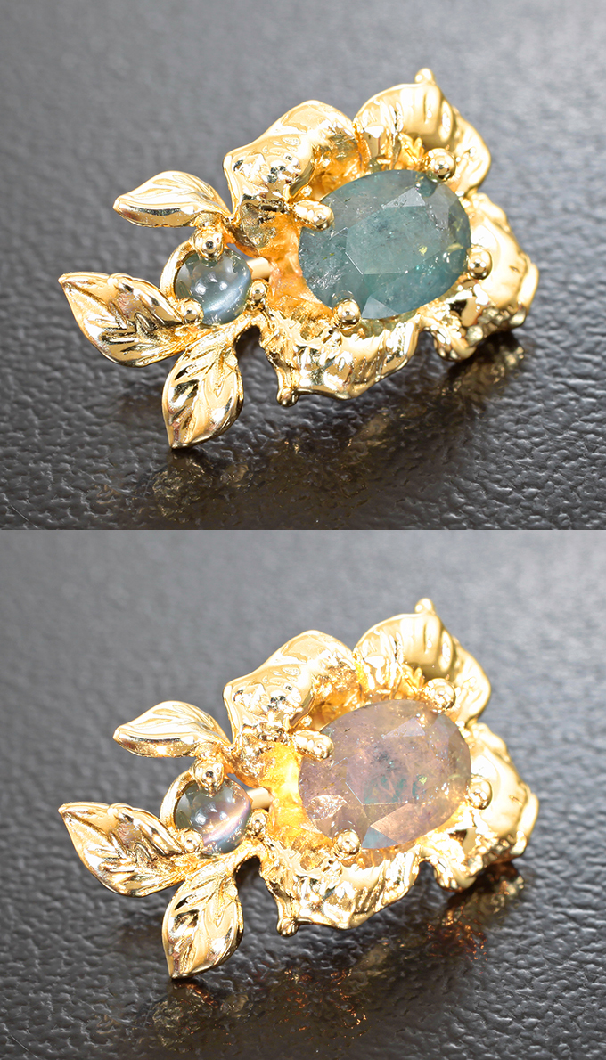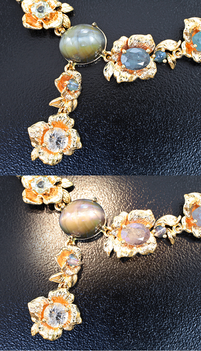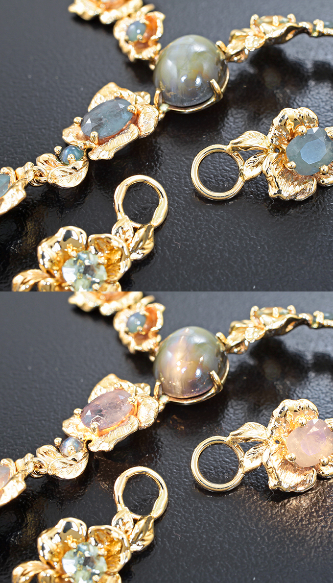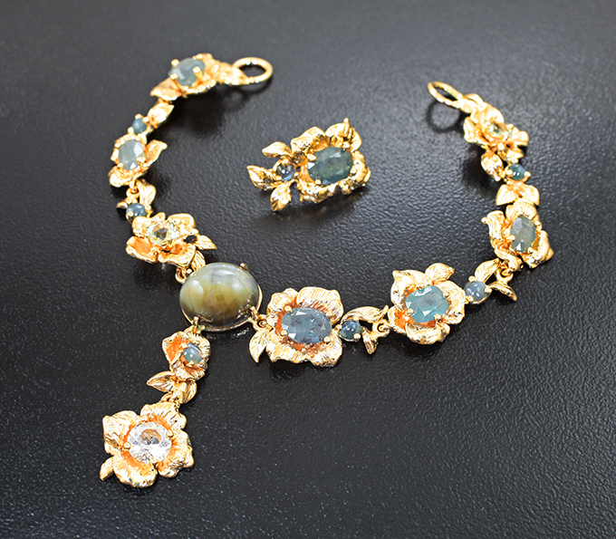 Вашему вниманию предлагается комплект (колье-подвес + пусета-кафф) из желтого золота 585 пробы с хризобериллами, александритами, чистейшими диаспорами и бесцветным ограненным фенакитом! Вес комплекта 17,05 г.