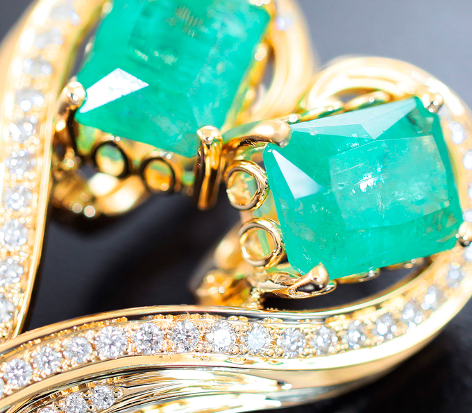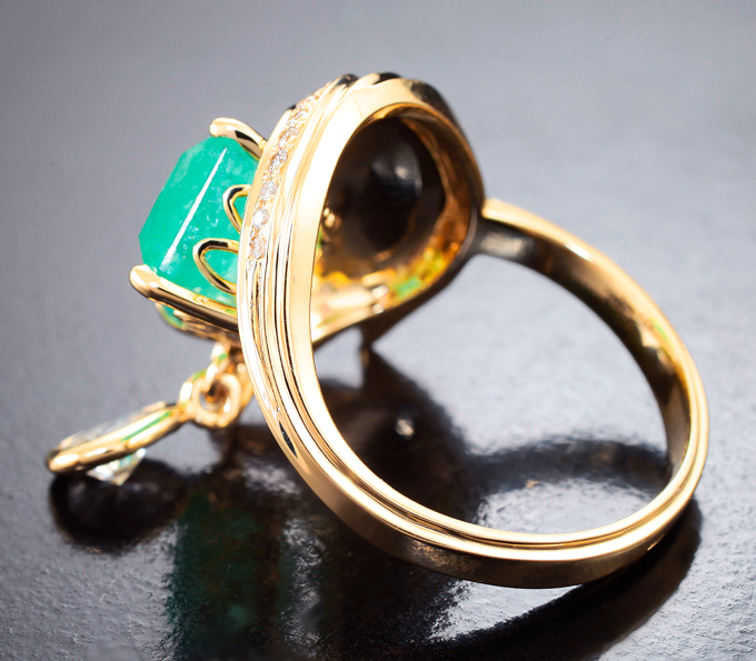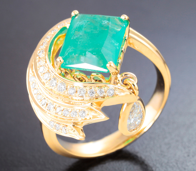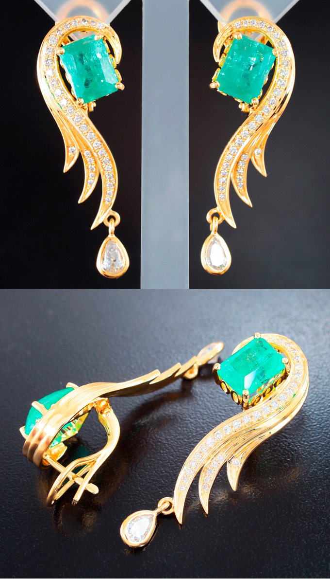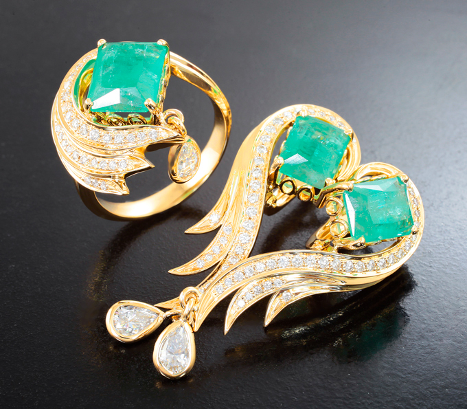 Вашему вниманию предлагается комплект (кольцо + серьги) из желтого золота 585 пробы с уральскими изумрудами, муассанитами и бриллиантами! Размеры дополнительной инкрустации 5 х 3 мм и 6 х 4 мм. Вес комплекта 22,89 г.