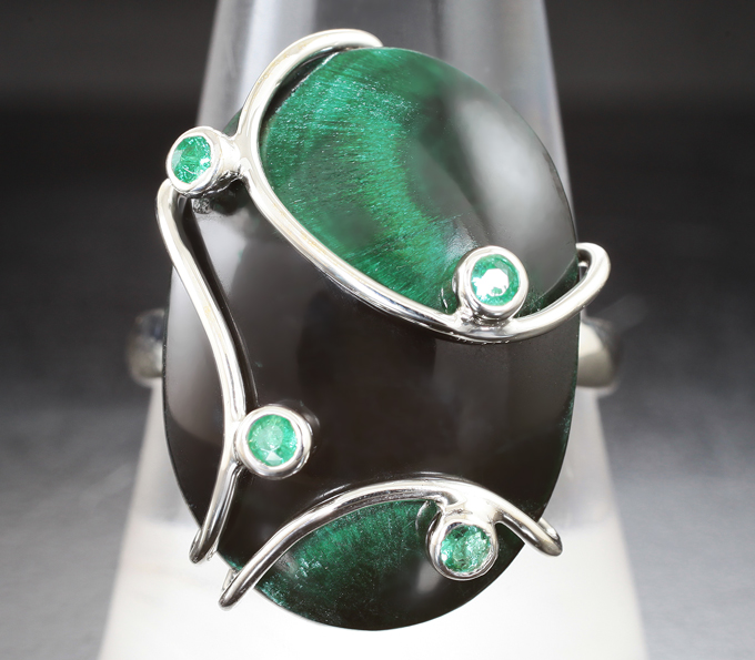 Вашему вниманию предлагается комплект (кольцо + кулон) из стерлингового серебра (925 проба) с плисовым уральским малахитом и изумрудами! Вес комплекта 12,49 г.