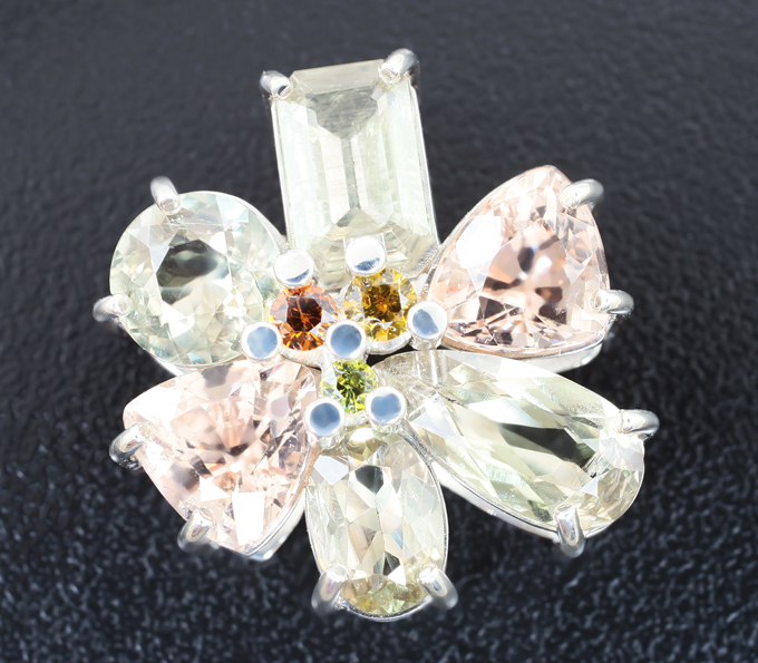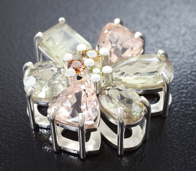 Кулон с диаспорами 5,76 карата, морганитами, уральскими топазолитами и демантоидом