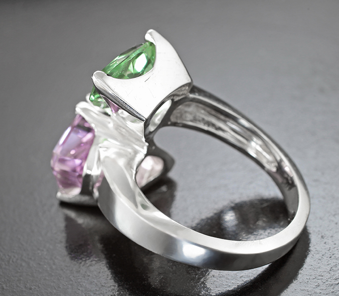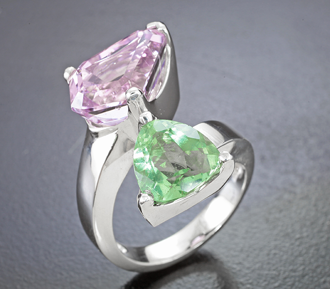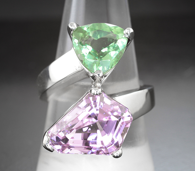Кольцо с кунцитом авторской огранки 8,66 и зеленым флюоритом 3,99 карат