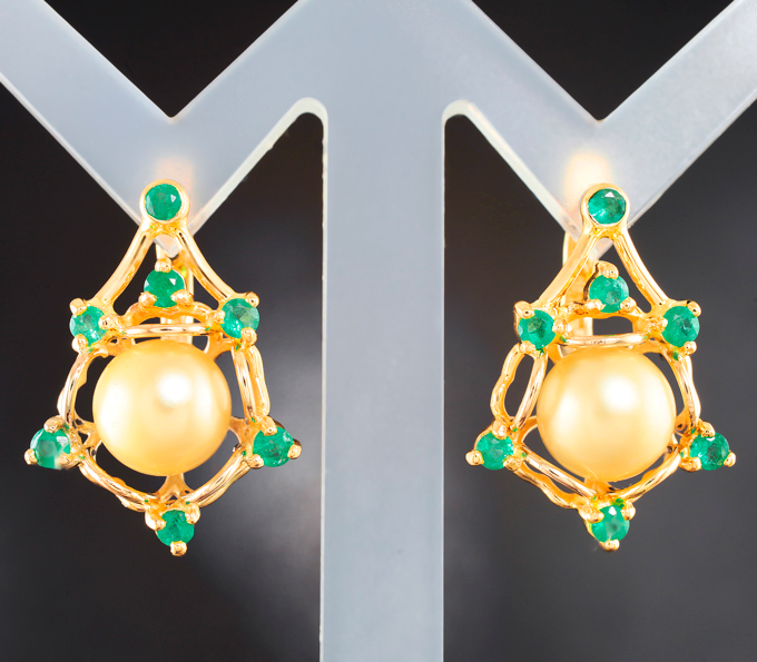 Комплект с золотистым морским жемчугом 14,76 карата и уральскими изумрудами