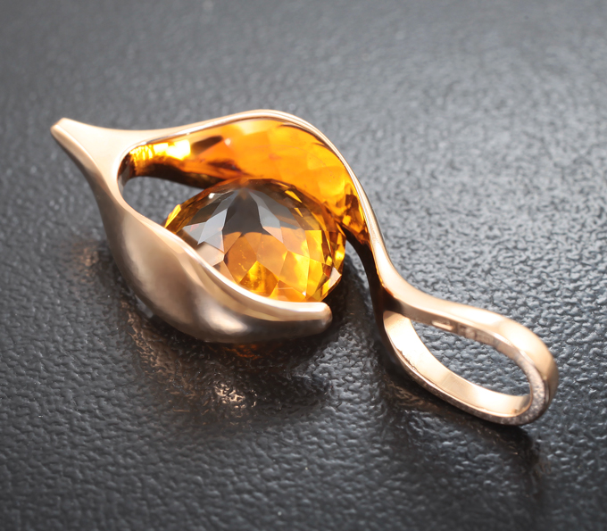 Вашему вниманию предлагается кулон из розового золота 585 пробы с чистейшим цитрином авторской огранки! Размеры кулона с петлей 34 х 13 мм. Вес изделия 4,42 г. Ниже приводятся ювелирные характеристики вставки.