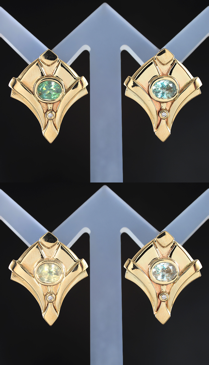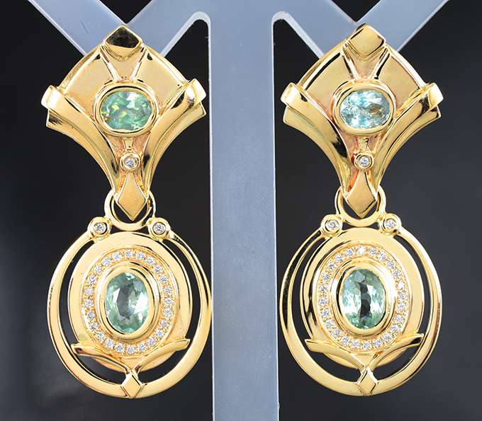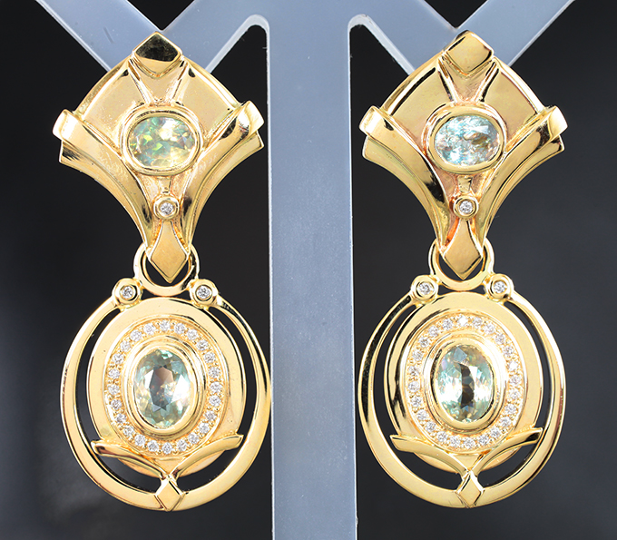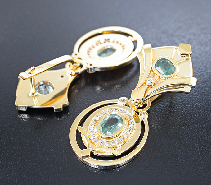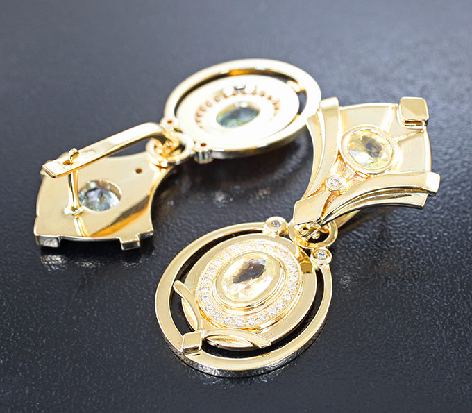 Вашему вниманию предлагаются серьги из желтого золота 585 пробы с уральскими александритами и бриллиантами! Площадка серег 46 х 20 мм. Вес пары 20,97 г. Ниже приводятся ювелирные характеристики вставок.