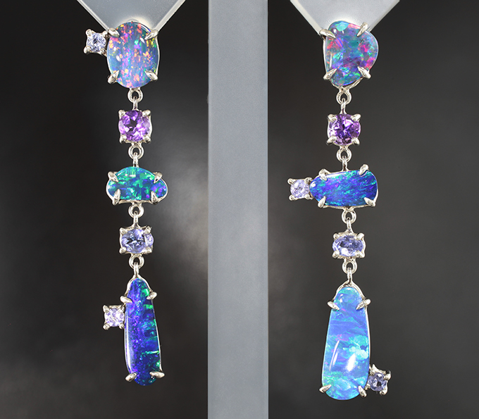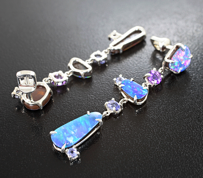 Серьги с австралийскими дублет опалами, аметистами и танзанитами