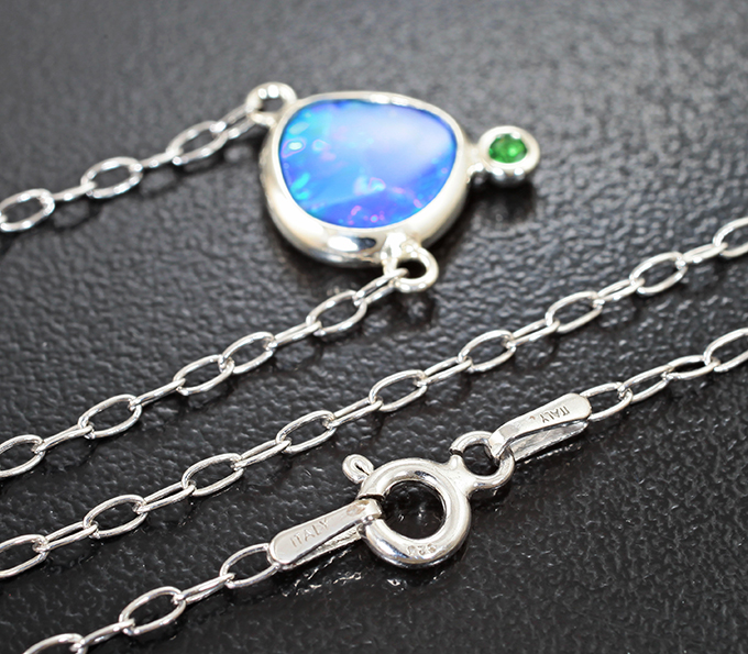 Вашему вниманию предлагается колье из стерлингового серебра (925 проба) с австралийским дублет опалом 1,84 карата и цаворитом гранатом! Размеры вставок 2 мм и 9 х 8 мм. Длина по цепочке 450 мм. Вес изделия 2,27 г.