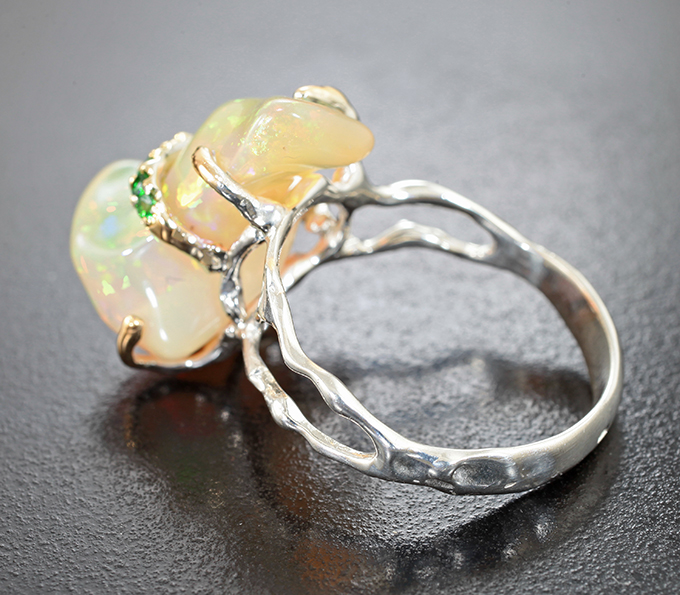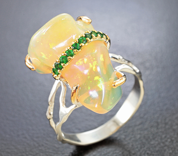 Кольцо с кристаллическим эфиопским опалом 9,87 карата и цаворитами