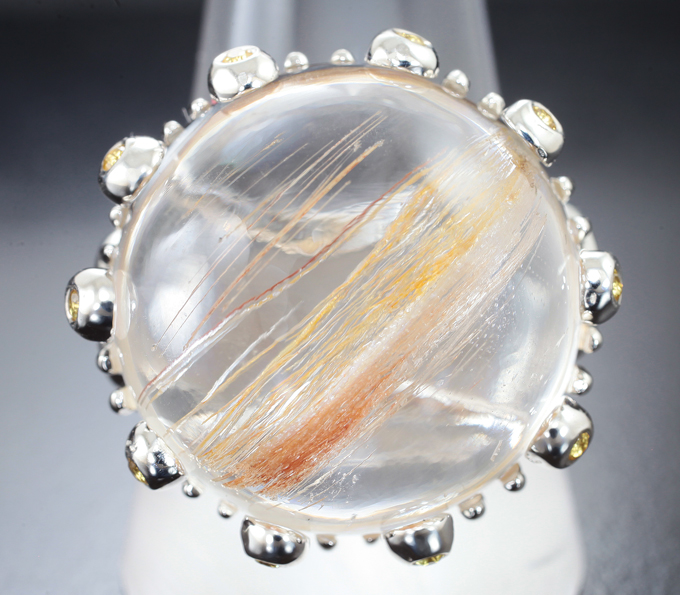 Вашему вниманию предлагается кольцо из стерлингового серебра (925 проба) c рутиловым топазом и сапфирами! Диаметр дополнительной инкрустации от 1,5 мм до 1,7 мм. Площадка 25 х 24 мм, высота 15 мм. Вес изделия 19,89 г. Размер 19,5. Ниже приводятся ювелирные характеристики вставки.