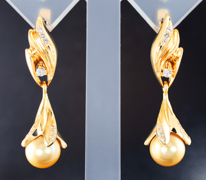 Вашему вниманию предлагаются серьги из желтого золота 585 пробы с золотистым морским жемчугом и лейкосапфирами! Диаметр дополнительной инкрустации от 1 мм до 2 мм. Площадка серег 35 х 10 мм. Вес пары 9,08 г. Ниже приводятся ювелирные характеристики вставок.