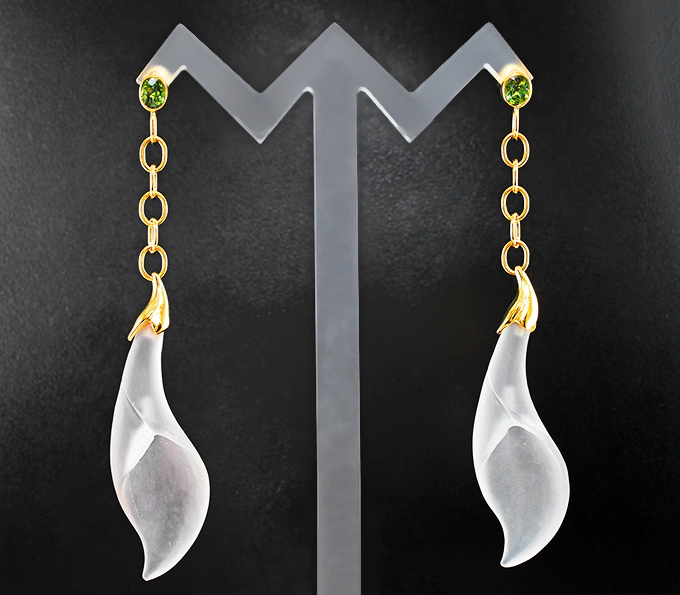 Серьги с резным бесцветным кварцем 58,03 карата и демантоидами гранатами