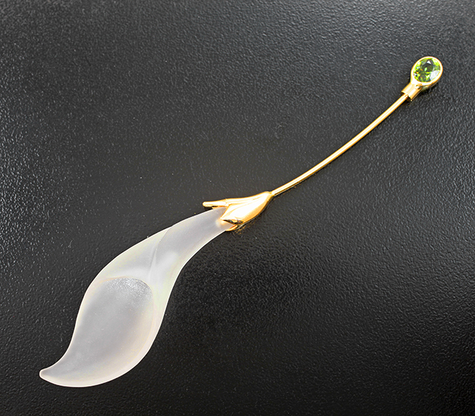 Брошь с резным бесцветным кварцем 28,03 карата и демантоидом гранатом