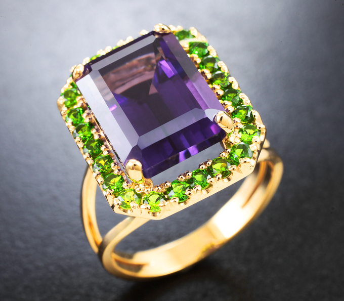 Кольцо с чистейшим уругвайским аметистом 7,63 карата и диопсидами