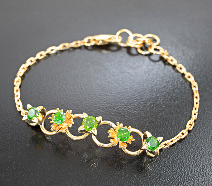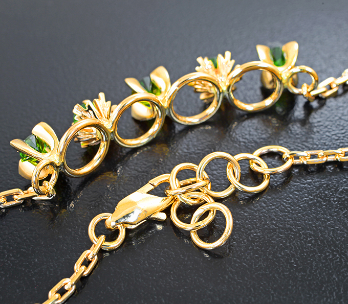 Вашему вниманию предлагается браслет из желтого золота 585 пробы с уральскими демантоидами! Длина браслета регулируемая: от 170 мм до 195 мм, ширина 8 мм. Вес изделия 9,28 г. Ниже приводятся ювелирные характеристики вставки.