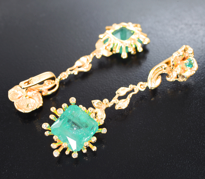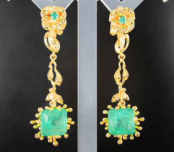 Вашему вниманию предлагаются серьги из желтого золота 585 пробы с уральскими изумрудами и бриллиантами! Диаметр дополнительной инкрустации 1,1 мм и 3,2 мм. Размеры серег с петлей 56 х 18 мм. Вес пары 14,21 г. Ниже приводятся ювелирные характеристики центральных вставок.