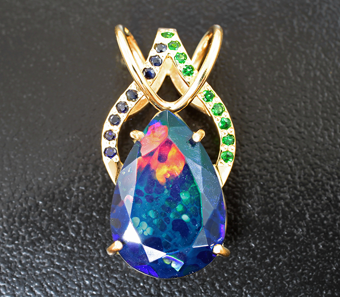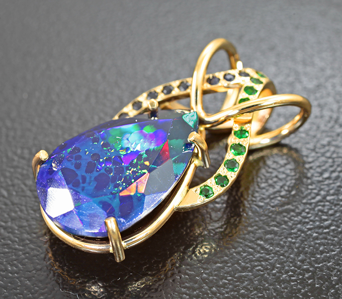 Кулон с ограненным черным опалом 3,97 карата, сапфирами и цаворитами