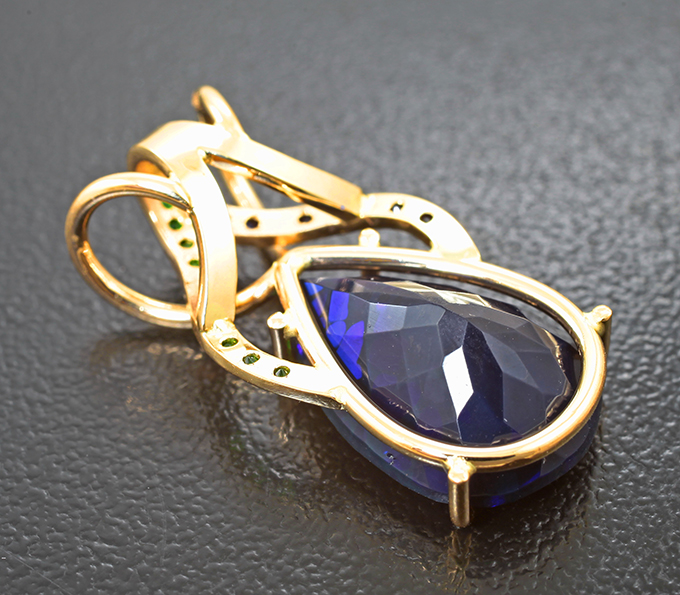 Вашему вниманию предлагается кулон из желтого золота 585 пробы с ограненным черным опалом, сапфирами и цаворитами гранатами! Диаметр дополнительной инкрустации от 1,1 мм до 1,25 мм. Площадка 25 х 13 мм. Вес изделия 2,75 г. Ниже приводятся ювелирные характеристики вставок.