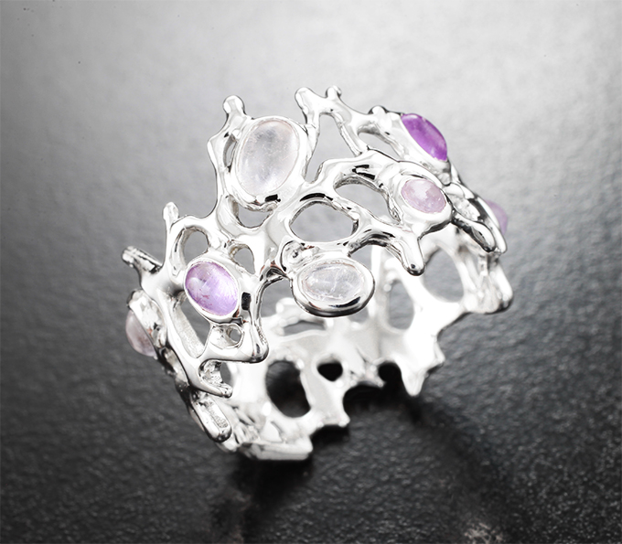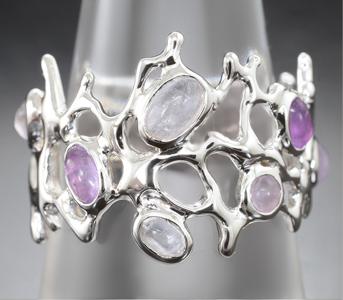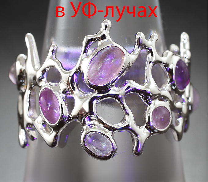 Вашему вниманию предлагается кольцо из белого золота 585 пробы c хакманитами! Ширина площадки 15 мм, высота 2 мм. Вес изделия 4,81 г. Размер 17,5. Ниже приводятся ювелирные характеристики вставок.