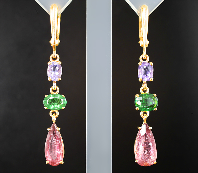 Серьги с хакманитами, цаворитами, рубеллитом и розовым турмалином
