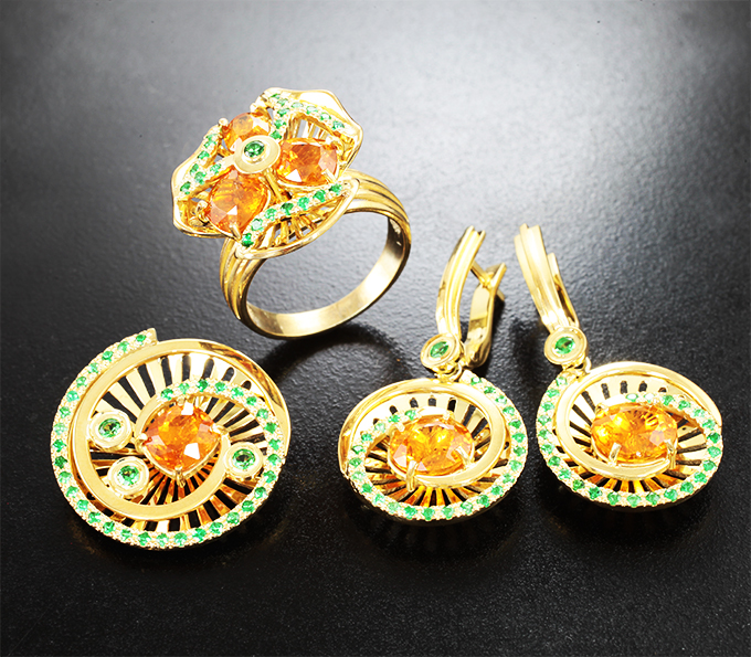 Вашему вниманию предлагается комплект (кольцо + серьги + кулон) из стерлингового серебра (925 проба) с клиногумитами и цаворитами гранатами! Изделие позолочено. Диаметр дополнительной инкрустации от 1,3 мм до 2,5 мм. Вес комплекта 20,93 г.