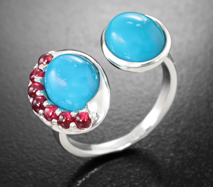 Кольцо с кабошонами армянской бирюзы 5,09 карата и рубинами