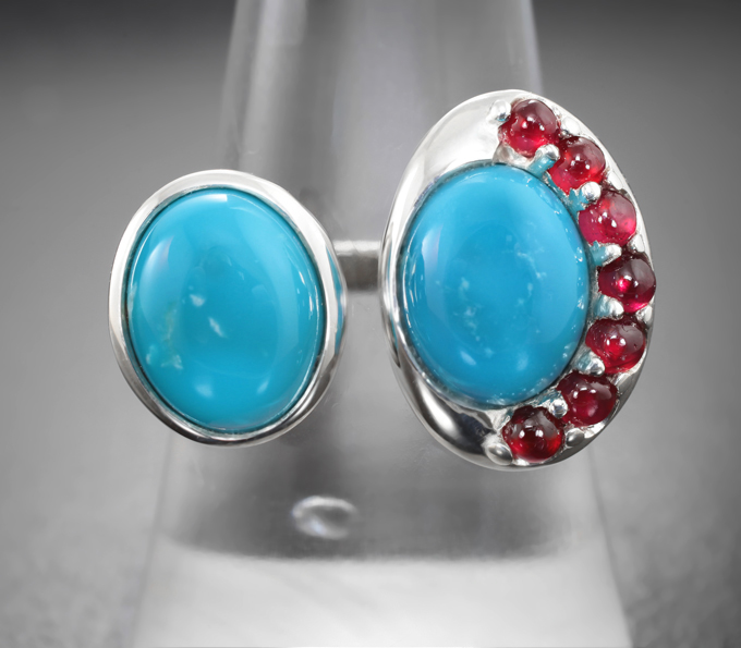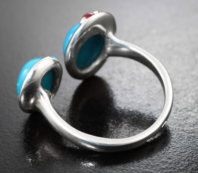 Вашему вниманию предлагается кольцо из стерлингового серебра (925 проба) c кабошонами армянской бирюзы и рубинами! Площадка 23 х 16 мм, высота 5 мм. Вес изделия 5,34 г. Размер 18,25. Ниже приводятся ювелирные характеристики.