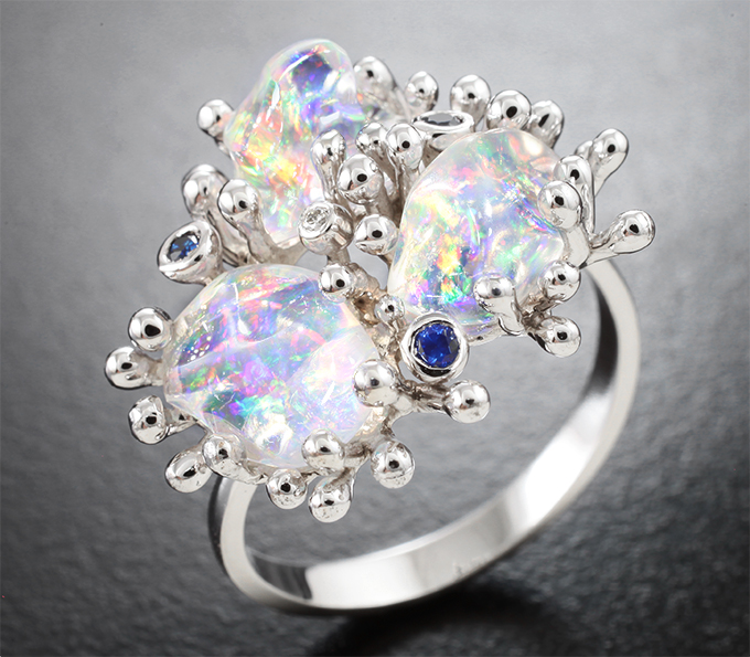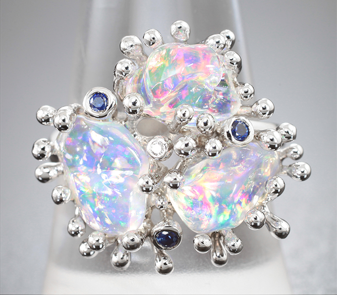 Кольцо с кристаллическими мексиканскими опалами 3,94 карата, сапфирами и бриллиантами