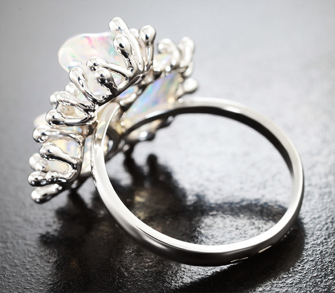 Вашему вниманию предлагается кольцо из белого золота 585 пробы с кристаллическими мексиканскими опалами, сапфирами и бриллиантами! Диаметр дополнительной инкрустации 1,3 мм и 1,7 мм. Площадка 22 х 20 мм, высота 6 мм. Вес изделия 5,46 г. Размер 18. Ниже приводятся ювелирные характеристики вставки.