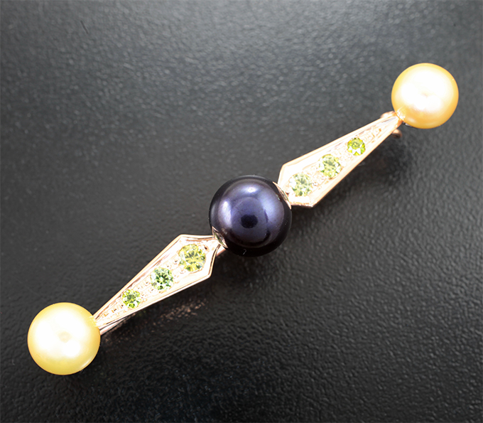 Брошь с цветным морским жемчугом 14,56 карата и уральскими демантоидами