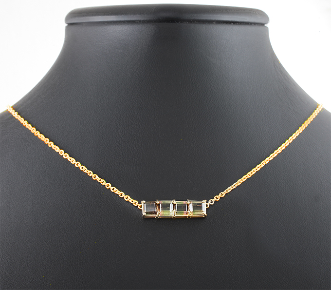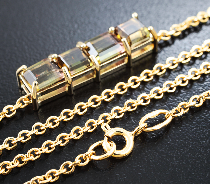 Вашему вниманию предлагается колье из желтого золота 585 пробы с арбузными турмалинами! Длина по цепочке 530 мм. Размеры подвески 24 х 7 мм. Вес изделия 7,4 г. Ниже приводятся ювелирные характеристики вставок.