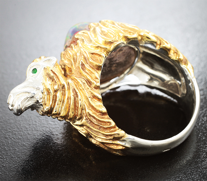 Вашему вниманию предлагается скульптурное кольцо из стерлингового серебра (925 проба) c кабошоном опала и цаворитами гранатами! Диаметр дополнителньой инкрустации 1,1 мм. Изделие частично позолочено. Площадка 36 х 18 мм, высота 12 мм. Вес изделия 21,9 г. Размер 18,5. Ниже приводятся ювелирные характеристики.