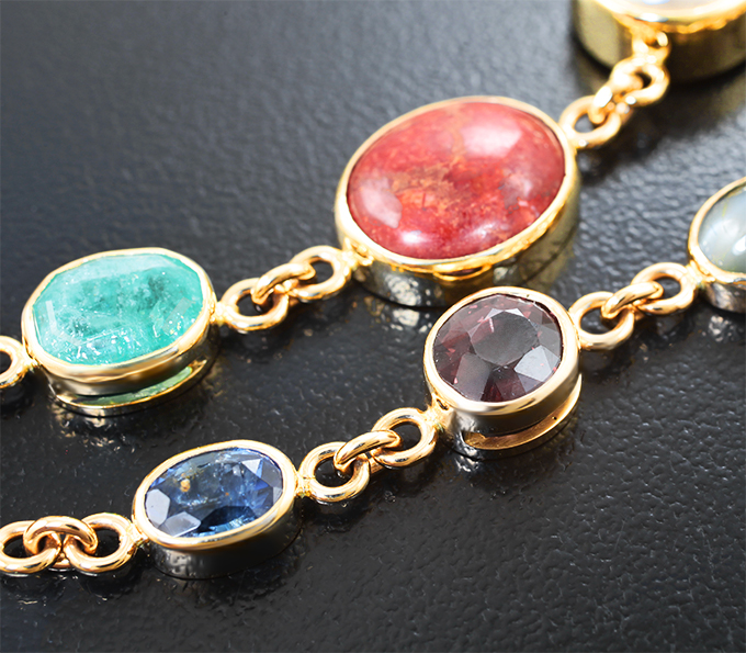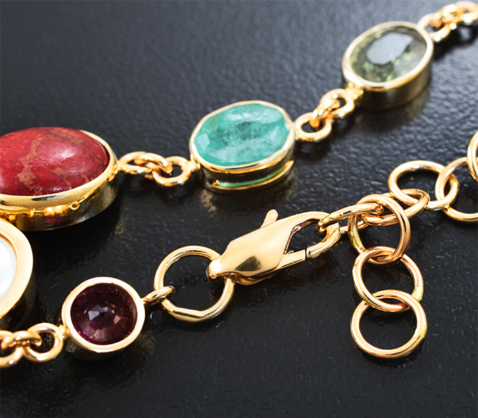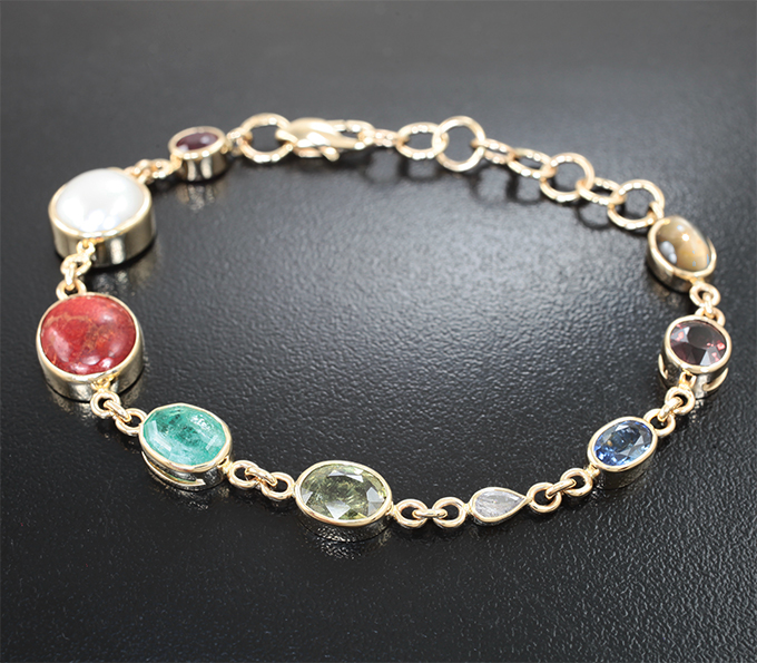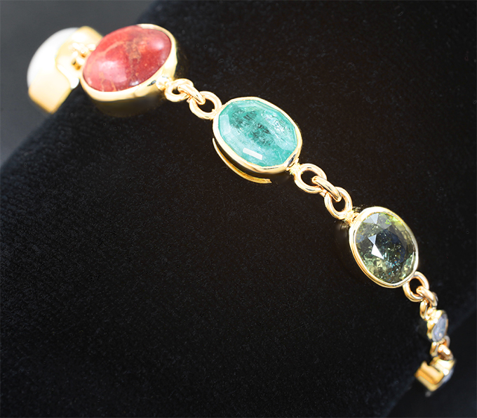 Браслет с рубином, жемчугом, кораллом, изумрудом, сапфирами, гранатом со сменой цвета, хризобериллом с эффектом кошачьего глаза и бриллиантом