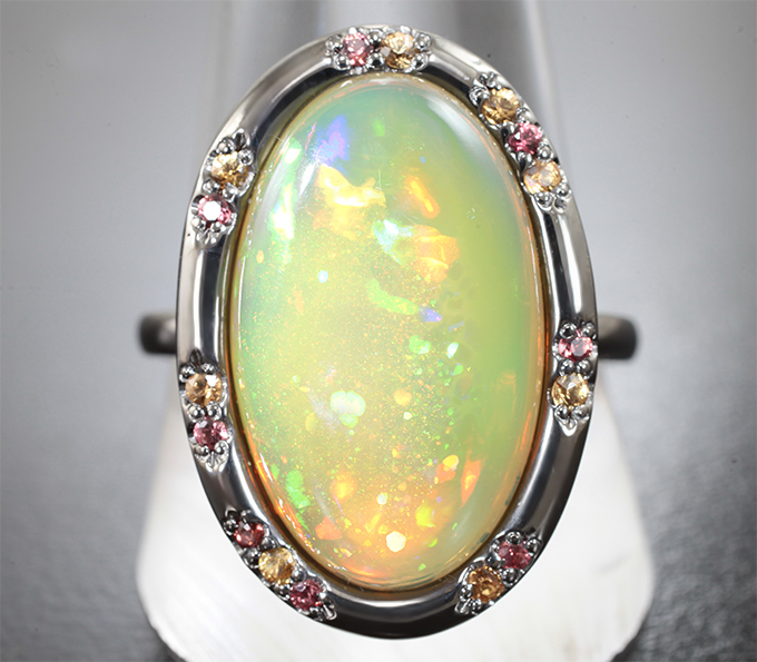 Кольцо с крупным кристаллическим эфиопским опалом 7,39 карата и разноцветными сапфирами