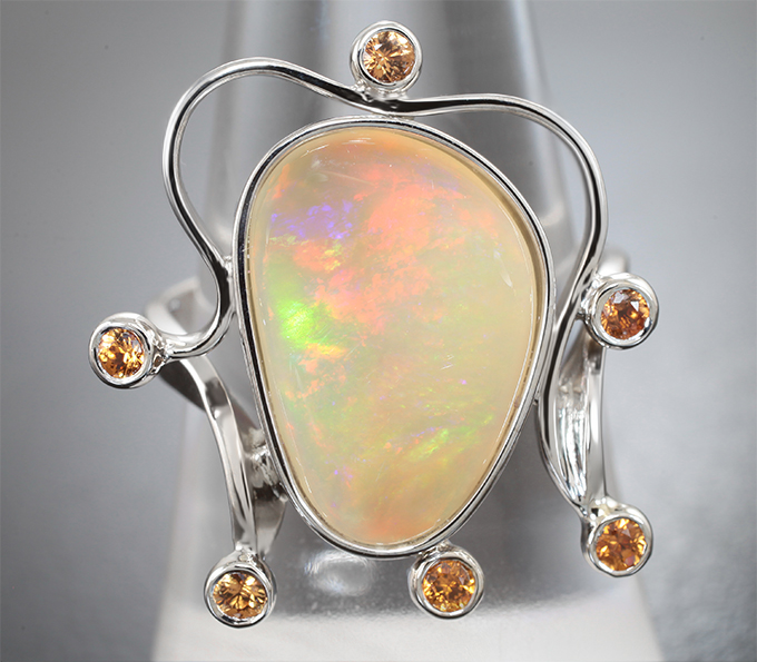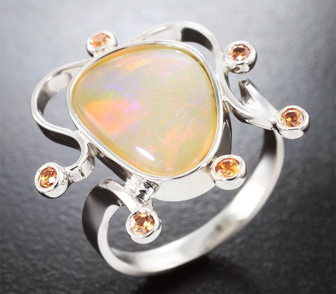 Кольцо с кристаллическим суданским опалом 4 карата и оранжевыми сапфирами