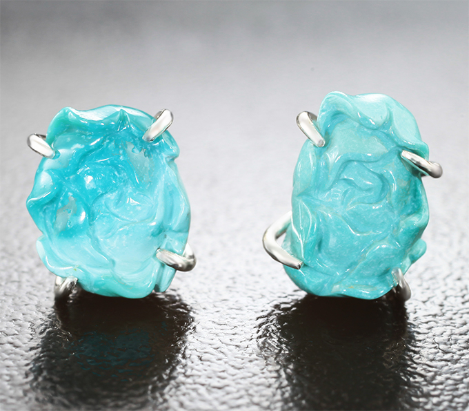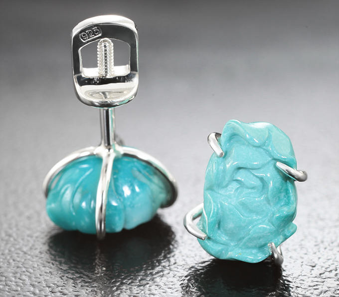 Вашему вниманию предлагаются пусеты из стерлингового серебра (925 проба) с резной армянской бирюзой! Площадка пусет 9 х 8 мм. Вес пары 2,4 г. Ниже приводятся ювелирные характеристики.