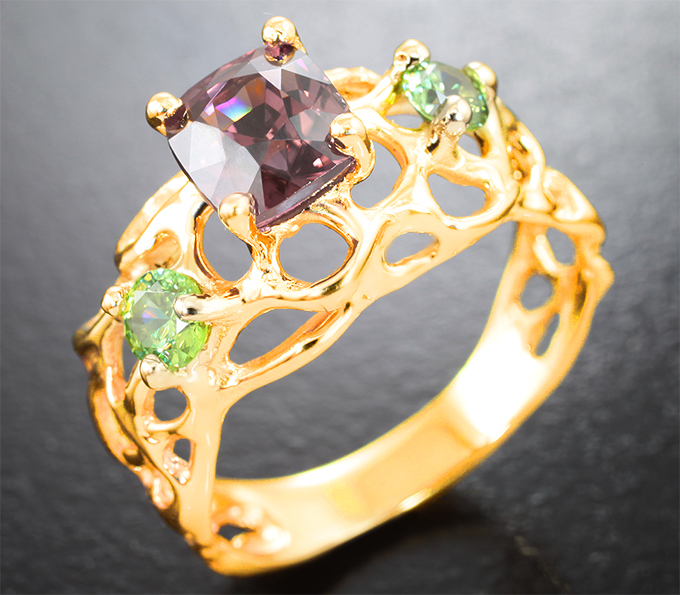 Кольцо с красным цирконом 2,23 карата и уральскими демантоидами