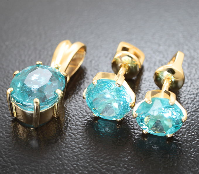Вашему вниманию предлагается комплект (серьги + кулон) из желтого золота 585 пробы с апатитами 5,89 карата! Размеры вставок 7 мм и 9 х 7. Вес комплекта 4,36 г.