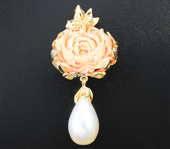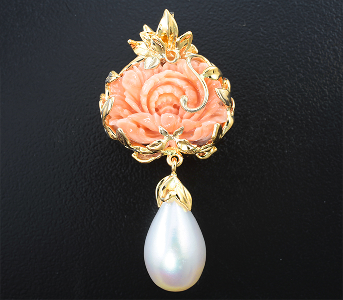 Кулон с крупным резным solid кораллом 15,32 карата и морской жемчужиной 9,78 карата