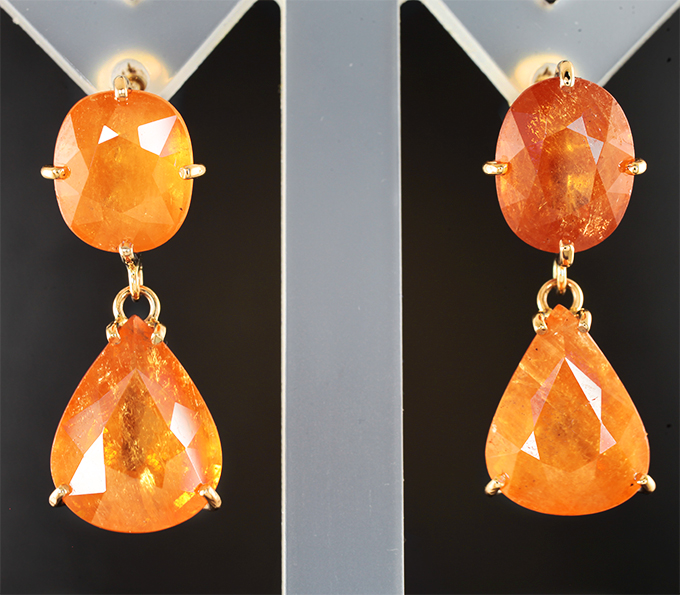 Вашему вниманию предлагаются серьги из желтого золота 585 пробы со спессартинами гранатами 27,91 карата! Размеры вставок от 10 х 8 мм до 14 х 11 мм. Площадка серег 30 х 11 мм. Вес пары 8,33 г.