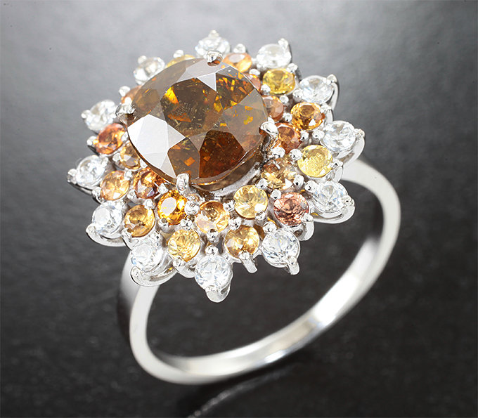 Кольцо с золотисто-желтым сфеном высокой дисперсии 3 карата и разноцветными сапфирами