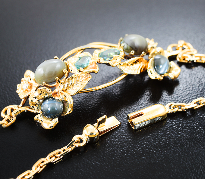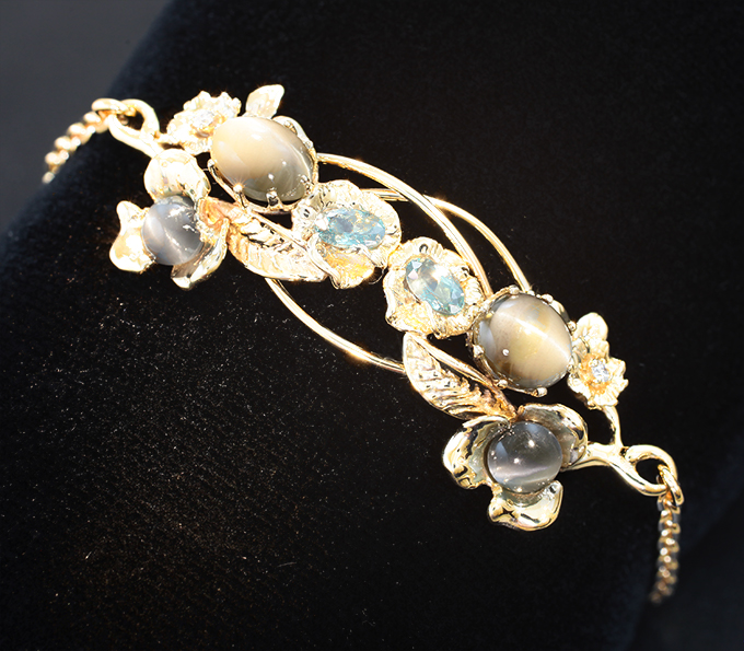 Золотой браслет с хризобериллами с эффектом кошачьего глаза 5,42 карата, топовыми уральскими александритами оттенка морской волны и бриллиантами