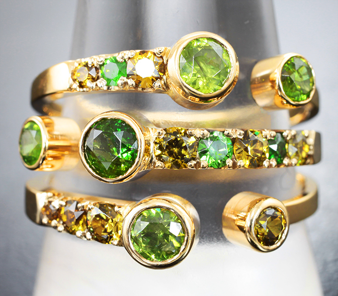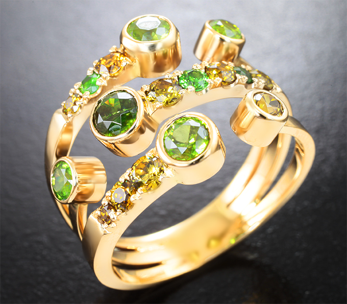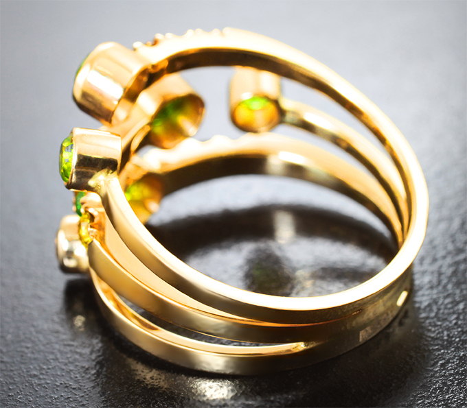 Вашему вниманию предлагается кольцо из желтого золота 585 пробы c уральскими демантоидами! Ширина площадки 16 мм, высота 4 мм. Вес изделия 7,49 г. Размер 20. Ниже приводятся ювелирные характеристики вставок.