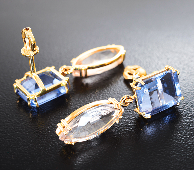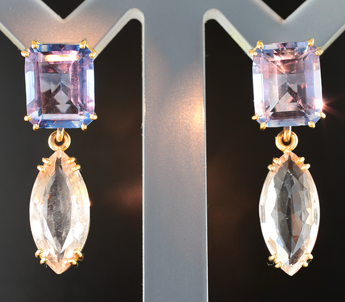 Вашему вниманию предлагаются серьги из желтого золота 585 пробы с флюоритами со сменой цвета и морганитами! Площадка серег 28 х 9 мм. Вес пары 5,17 г. Ниже приводятся ювелирные характеристики вставок.