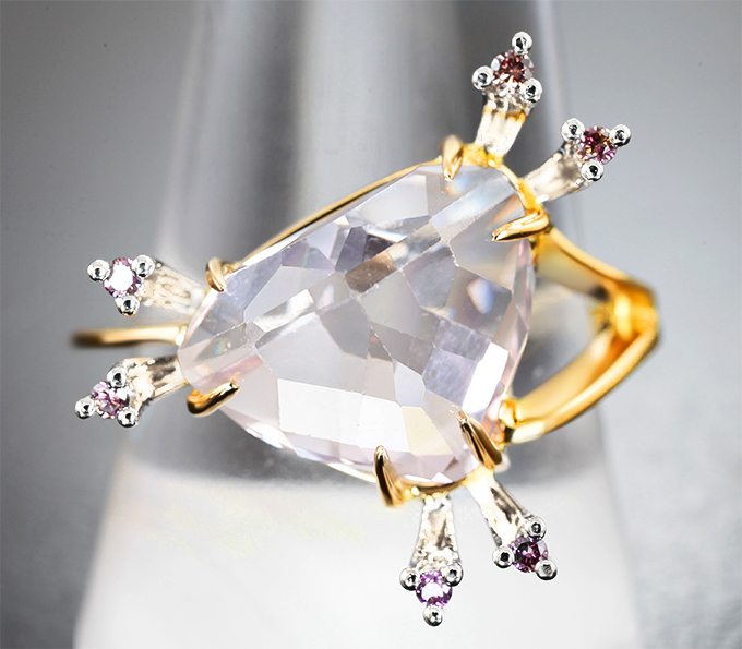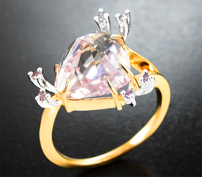 Кольцо с полихромным кунцитом авторской огранки 8,15 карата и розовыми бриллиантами