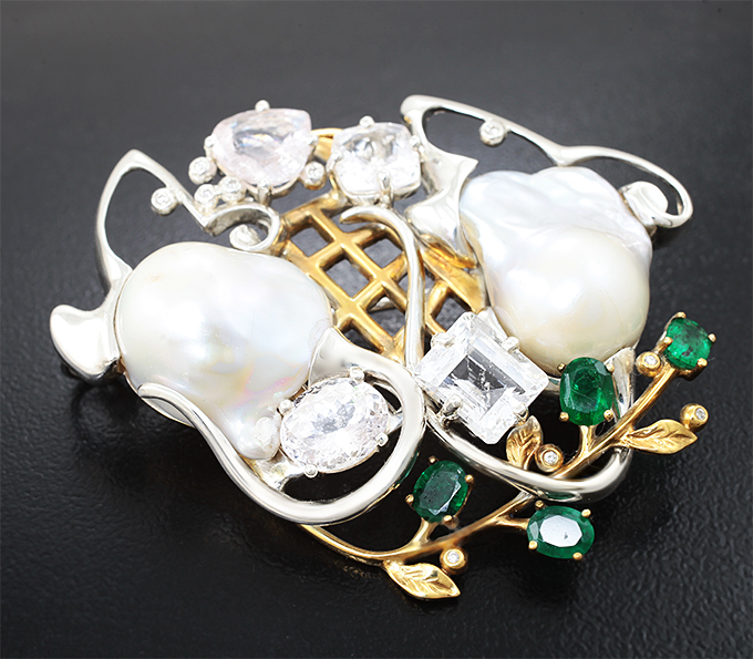 Брошь c морским жемчугом барокко 37,58 карата, морганитами пастельных оттенков, изумрудами и бриллиантами!