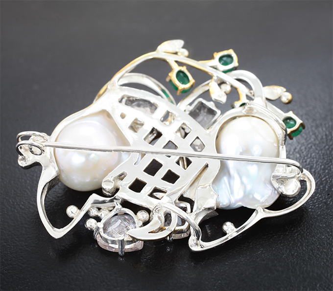 Вашему вниманию предлагается брошь из стерлингового серебра (925 проба) c морским жемчугом барокко, морганитами пастельных оттенков, изумрудами и бриллиантами! Изделие частично позолочено. Размеры изумрудов 5 х 4 мм, диаметр бриллиантов 1,1 мм и 1,3 мм. Площадка 55 х 42 мм. Вес изделия 25,62 г. Ниже приводятся ювелирные характеристики вставок.