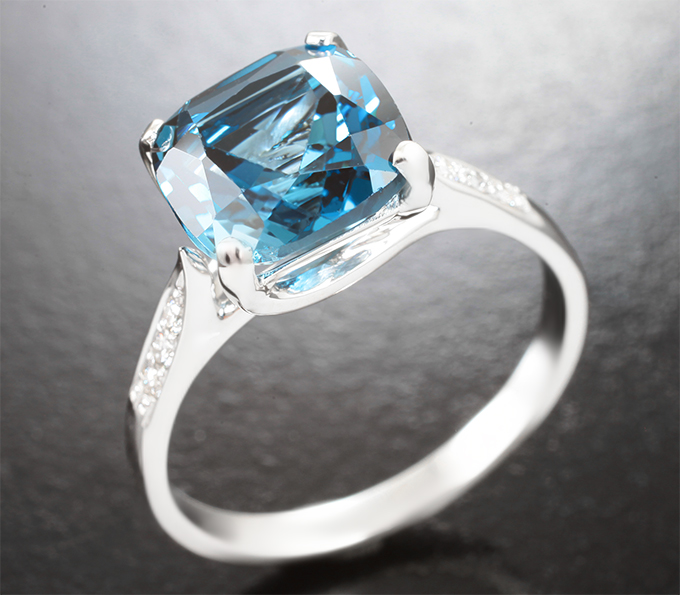 Вашему вниманию предлагается кольцо из белого золота 750 пробы c чистейшим синим London топазом и бриллиантами! Площадка 9 х 9 мм, высота 7 мм. Вес изделия 3,91 г. Размер 18. Ниже приводятся ювелирные характеристики вставки.